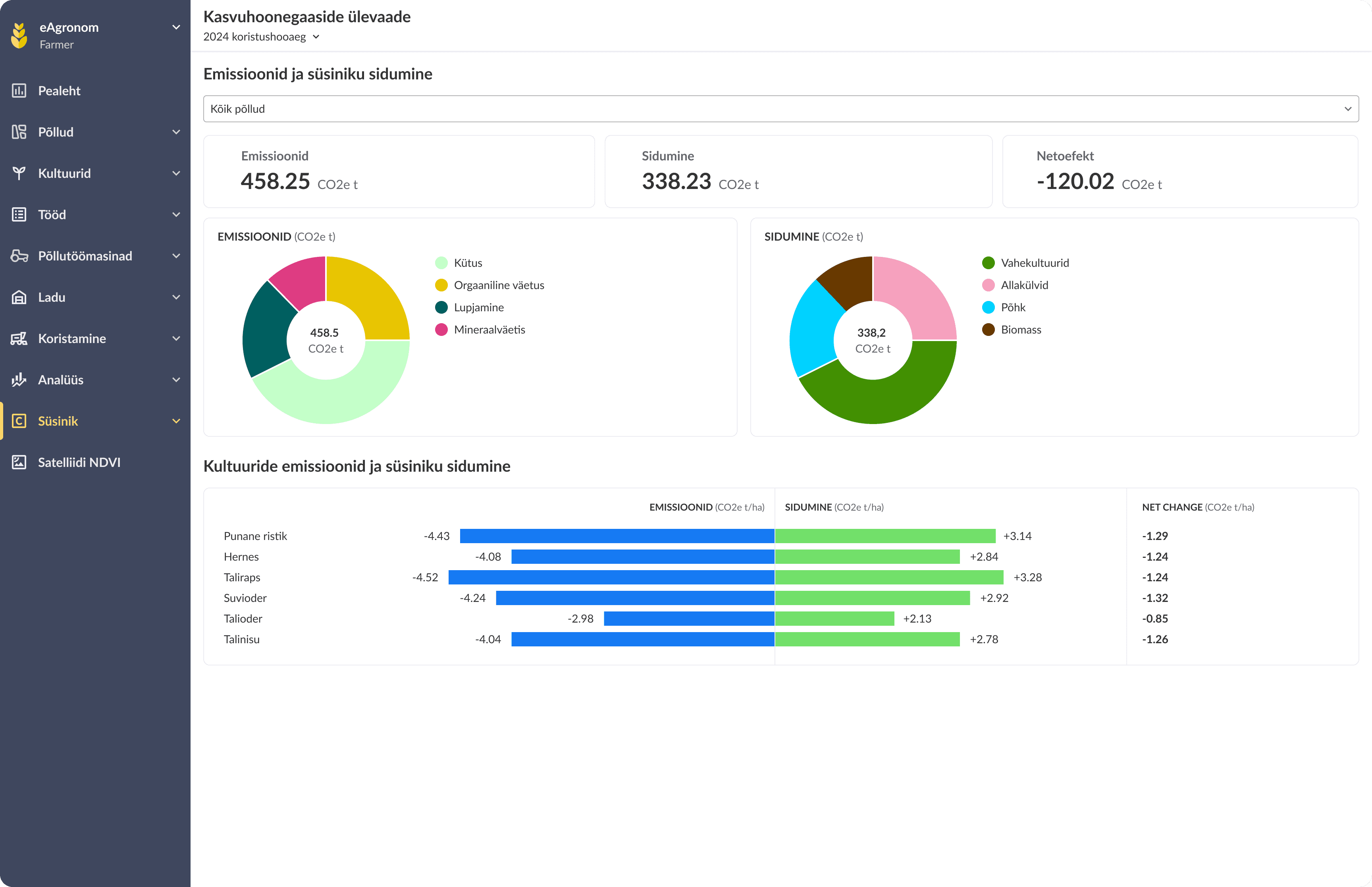 Rakendus näitab, kui palju Sinu tootmine kasvuhoonegaase tekitab. Tarkvara saad liidestada oma põllutöömasinatega. Viljavaheldust ja kattekultuuride kasvatamist saad hõlpsalt tõendada satelliitseire abil või tellida füüsilise ülevaatuse.